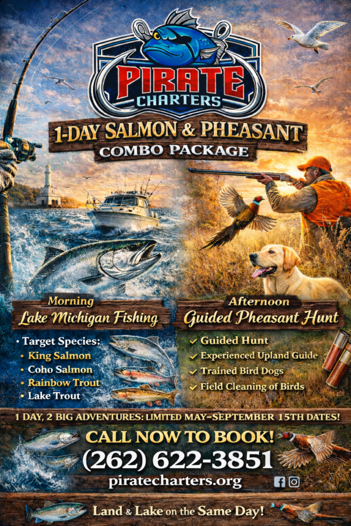 Experience the best of Wisconsin land and water in one unforgettable day. Pirate Charters now offers an action-packed combo trip pairing Lake Michigan salmon fishing with an exciting pheasant hunt.